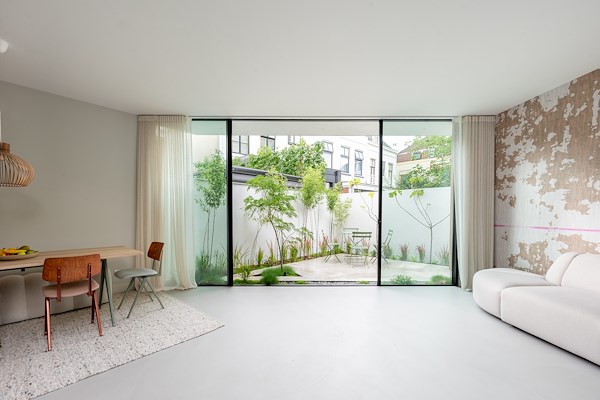 Door de hoeveelheid glas en grote schuifdeuren aan weerszijden van de uitbouw vervagen binnen en buiten, en heb je in de zomer het idee dat je in de uitbouw slechts onder een overkapping zit, die heel koel blijft. Op de begane grond zijn naast de uitbouw twee royale slaapkamers gerealiseerd en een 2e badkamer, waardoor de begane grond gebruikt kan worden als woon- en slaapverdieping met eigen sanitair en keuken als uitbreiding van de bovengelegen bovenwoning. Dit maakt de woning geschikt voor bewoning door twee huishoudens. Tevens is de voorgevel hersteld naar de oorspronkelijke situatie, hier ontsierde een garagedeur de symmetrie met het naastgelegen pand.
