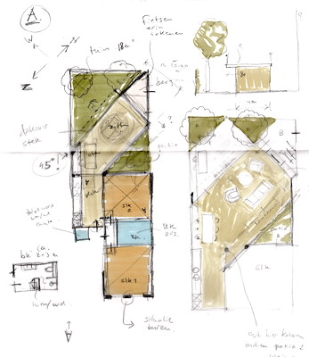 We bedachten een plan om de volledig bebouwde ruimte achter de woning te slopen en een nieuw bouwvolume diagonaal achter de woning te plaatsen, zodat er ondanks de uitbouw nog steeds daglicht in de oorspronkelijke woonverdieping kon dringen. Er ontstonden daardoor twee driehoekige patio’s die als buitenkamers zijn mee-ontworpen, en zijn ingericht naar een heel passend tuinontwerp van