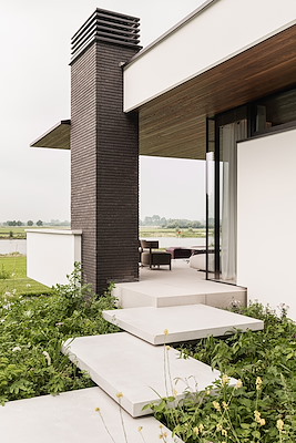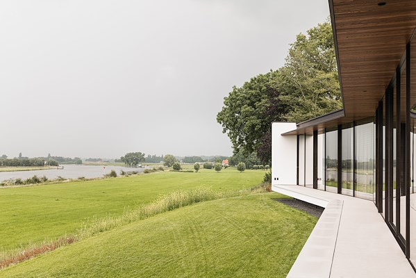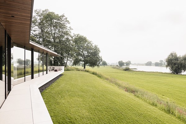 Zowel binnen als buiten zijn er houtaccenten toegepast, waardoor het huis een warme uitstraling heeft. Om eenheid en rust te creëren lopen vloeren en plafonds door naar buiten. De lichte knik in de gevel biedt vanuit de ouderslaapkamer zicht op het huis. Dat geeft een veilig en geborgen gevoel, ook als het water in de uiterwaarden stijgt.