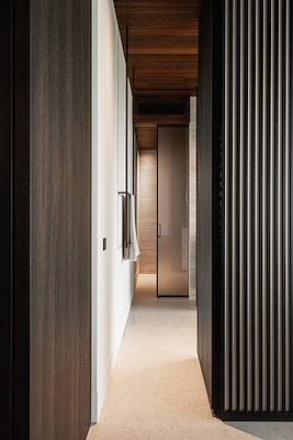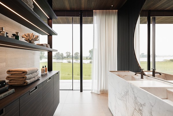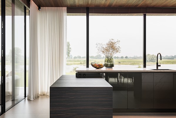 De route naar het hart van de woning is als een wandeling vanuit het bos naar de rivier. De met hout omlijste toegang stelt het zicht op de rivier nog even uit. De woning opent zich pas in de woonkeuken, met spectaculair uitzicht op de uiterwaarden en de rivier.