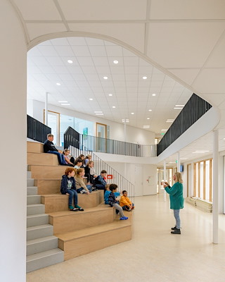 Het gebouw heeft een open karakter en straalt rust uit. Daglicht valt op een natuurlijke manier daglicht binnen, wat bijdraagt aan een prettige leeromgeving.