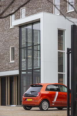 De bestaande omgeving en het ontwerp van deze rechthoekige massa vraagt om een uitzonderlijk architectonisch ontwerp. Omdat de entree aan de zijkant van het pand is, was het onze uitdaging om de entree prominent aanwezig te laten zijn vanuit het vooraanzicht van het pand.
