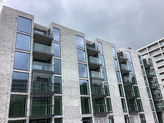 Waar het gebruik van witgrijze baksteen het gebouw tactiliteit en een toegankelijke uitstraling geeft, zorgen ruime balkons voor extra dynamiek, levendigheid en woongenot.