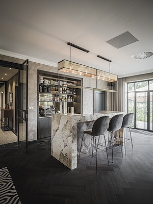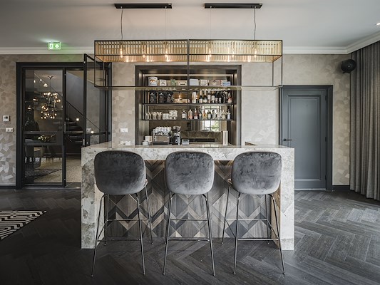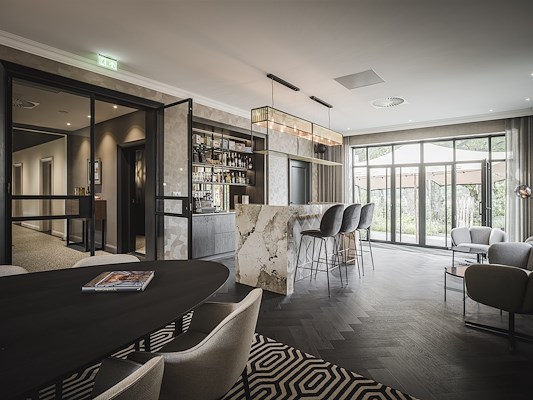 In de entreeruimte word je als bezoeker verwarmd en omarmd door een warm en luxe sfeerbeeld. Rijke en natuurlijke materialen, een hoog afwerkings- en detailniveau en stijlvol maatwerk zorgen samen voor het prettige gevoel dat je welkom bent. Bovendien is het meteen duidelijk dat je in een bijzondere werkomgeving terecht bent gekomen. Via de entreeruimte, die gelijkenissen vertoont met de lobby van een luxe hotel, bereiken we een sfeervolle ruimte met een oogstrelende bar, een comfortabel zitgedeelte en een royale eettafel. Bijzonder behang, sfeerverhogende verlichting en het bijzondere vloerkleed vervolmaken in combinatie met het zicht op de tuin het luxe totaalbeeld.