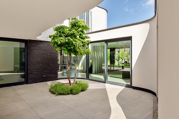 Binnen kadreren de ronde vormen de leefkeuken. De ronding begint met de patio en loopt door in de trap en naar buiten. Grote glaspuien maken de leefvertrekken ruimtelijk en transparant. De opeenvolging van doorzichten zorgen ervoor dat er contact is met de omgeving en elkaar.