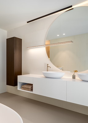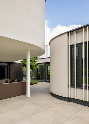 Het moderne rechthoekige huis vormt een strak kader voor de rondingen, wat zowel een spannend als een verzachtend contrast oplevert. De rondingen overbruggen de niveauverschillen tussen de straat en de hoge bosrand achter het huis. Het beeld aan de achterzijde is helemaal strak, waardoor de woning onderdeel is van het blok.