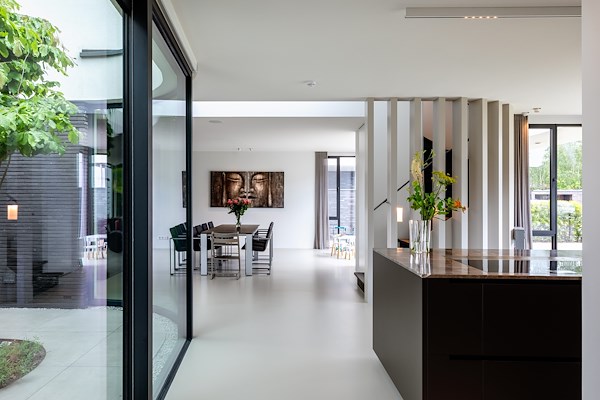 De knusse zitkamer, deels gescheiden van de keuken, kijkt uit op de tuin en de patio. De patio en vide (daklicht) zorgen ervoor dat er veel daglicht binnenkomt, ook in het midden van de woning.