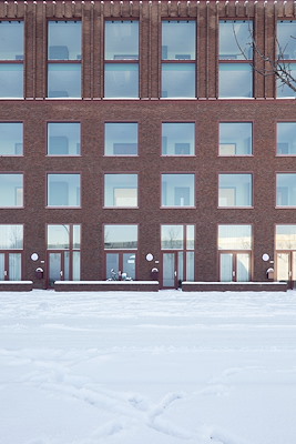 De het geheel is opgebouwd in een rode baksteen gelijk aan de woningen maar met een andere kleur voeg. De accenten worden afgekaderd met rode glazuurstenen in tegelmotief.