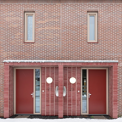 De uiteinden moeten een stevig accent bieden. De ramen krijgen hier een geglazuurde frame. De ingangen van de huizen zijn bijna altijd in paren ontworpen, met een groot frame in rood geglazuurde baksteen. Compositorisich zakken de ramen aan de voorkant enigszins door.