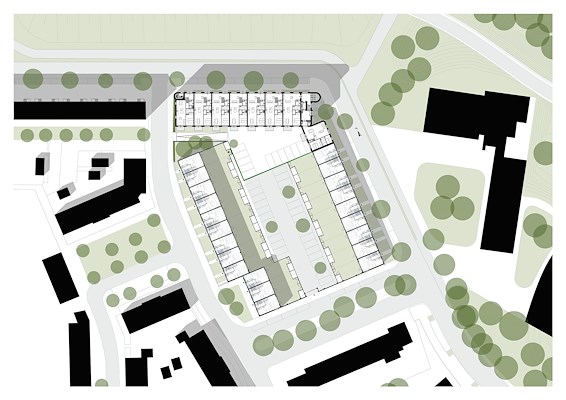 In twee stroken volgen de huizen de bouwlijnen van de bestaande gebouwen. Het appartementengebouw gaat in schaal op in de grotere infrastructuur aan de noordzijde. De formele hogere uiteinden bieden het nodige tegenwicht voor de grotere gebouwen rondom, terwijl de tussenliggende woningen een dialoog aangaan met de bestaande wijk uit de jaren ’50 Wyckerveld. Dus het functioneert als een bemiddelende woonblok. In architectonische thema’s hebben we inspiratie gehaald uit de Amsterdam -schoolwoningen (door Gulden en Geldmaker 1920) richting het stadscentrum.