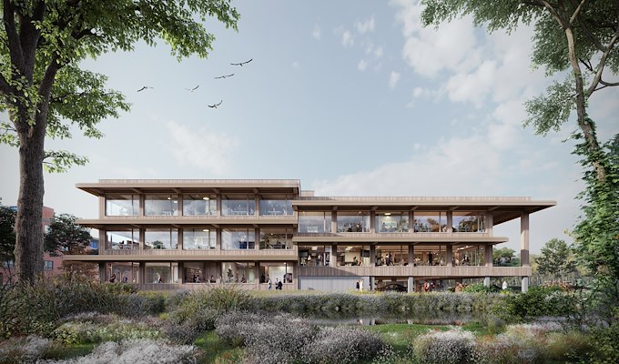 De hoofddraagconstructie is, met uitzondering van de begane grondvloer, uitgevoerd in hout. De verdiepingsvloeren en dakvloer bestaan uit houten kanaalplaatvloeren en de kolommen zijn van hout. TRAJECT heeft middels een parametrische analyse de oriëntatie van het gebouw, isolatiewaardes, glaspercentages en luchtdichtheid bepaald. Door slim gepositioneerde overstekken aan de gevel en passende detaillering kent het gebouw een lage energiebehoefte en zijn pv panelen niet opgenomen in het ontwerp.