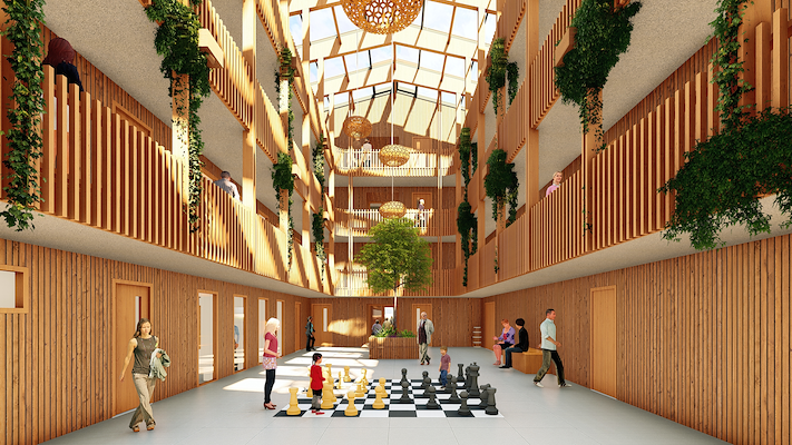 Alle woningen grenzend aan dit atrium bieden direct zicht op de gezamenlijke ruimte. Deze opstelling zorgt ervoor dat bewoners gemakkelijk toegang hebben tot het atrium en elkaar eenvoudig kunnen ontmoeten in een veilige en vertrouwde omgeving. Laagdrempelig samenkomen voor een kopje koffie, het grote schaakspel op de vloer of gewoon een praatje draagt bij aan een gevoel van gemeenschap en verbondenheid terwijl de individuele woningen privacy en comfort bieden.