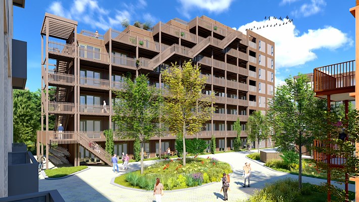 Onze visie voor dit project is geworteld in het respecteren van de natuurlijke omgeving. De vorm van de gebouwen past naadloos in het stedenbouwkundige plaatje en benadrukt de kwaliteiten van de buitenruimtes. Elk bouwblok wordt gekenmerkt door een aantrekkelijke brede houten galerij die tevens dienstdoet als buitenruimte voor de bewoners. De gevels zijn vervaardigd van duurzaam bamboehout en de galerijen van azobehout, kortom een perfecte symbiose tussen architectuur en natuur.