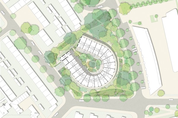 ROOT ligt op een centrale plek in de Eindhovense buurt Mensfort: grenzend aan het groene hart van de wijk en het knooppunt van drie wijkroutes, ontmoeten diverse bebouwingstypen elkaar hier. Langs de soepele gekromde lijn van het volume komt een overgangszone tussen die verschillende soorten omgevingen. Er ontstaan zo bovendien twee werelden: een openbaar stadspark, waarin ook de bestaande oude bomen kunnen blijven staan, en een collectieve binnentuin voor de bewoners. Wandelpaden verbinden het park met de omgeving. Rond de binnentuin worden alle woningen ontsloten door brede galerijen, waar het zonlicht van boven binnendringt, en die iets verhoogd boven de tuin hangen. Zo ontstaan zitplekken waar genoten kan worden van intimiteit en rust.