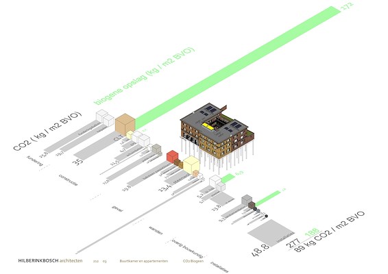 Dit uitgangspunt, samen met het tijdens het ontwerptraject gegroeide inzicht wat de consequenties voor de bouwsector zijn om binnen de gestelde 1,5 graad opwarming te blijven zijn de redenen geweest om actief aan de materiaalgebonden CO2 uitstoot te gaan rekenen. Voor de uitgangspunten van de berekening zijn wij zo dicht mogelijk bij de getalswaarden van de Nationale Milieudatabase gebleven, aangevuld met informatie uit EPD’s.