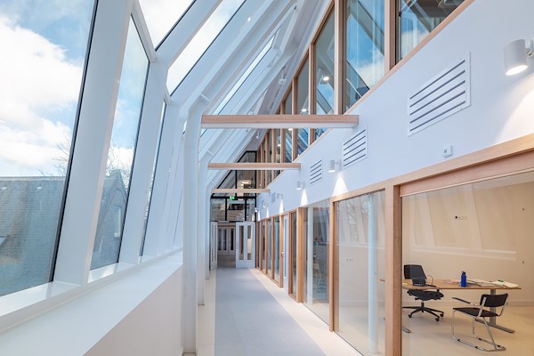 Revitaliseren van een monument is vaak een uitdaging. Sommige ingrepen waren niet mogelijk, waardoor alternatieve oplossingen moesten worden bedacht. Zo was het aanbrengen van extra ramen bijvoorbeeld niet toegestaan. Om toch daglicht binnen te laten in de donkere gangen hebben we de wanden tussen de lokalen en gangen vervangen door grote glaspanelen. Ook zijn de bogen boven de deuren open gemaakt en voorzien van glas. Daarnaast zijn de kleine lokalen samengevoegd tot grotere ruimtes met een leerplein ertussen. De muren zijn wit geschilderd zodat ze het licht weerkaatsen.