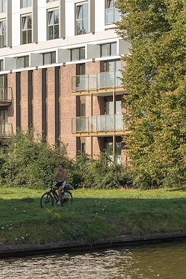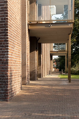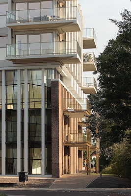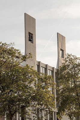 Oudbouw en nieuwbouw gaan samen als twee dansers. De een kan niet zonder de overgave van de ander. In structuur en karakter reageert de nieuwbouw op de bestaande kerk. Ook het ritme tussen de twee bouwdelen speelt een spannend spel, soms komen ze samen om elkaar daarna weer los te laten en verderop weer te ontmoeten. In de kloeke baksteenwanden van het bestaande gebouw zijn sleuven weggezaagd om voldoende daglicht binnen te laten stromen in de woningen. In kleur en toon sluit de nieuwbouw aan bij de bestaande baksteen en het warme beton. In materiaal en textuur vormt het een contrast: de aluminium gevelpanelen en geanodiseerde kozijnen vangen ieder moment van de dag anders licht. Een spel dat versterkt wordt door de kleine hoekverdraaiing in de gevelpanelen en in de verticale gevelpenanten. In dit spel van kleine verdraaiingen is er een dialoog tussen de oudbouw en de nieuwbouw. In de woningplattegronden komen de niet haakse ontmoetingen van de buitengevels het meest voelbaar terug in de woonkamers. Deze zijn altijd op de hoek gepositioneerd met uitzicht over Voorburg, Den Haag en wie op de bovenste woonverdiepingen ver over de Vliet kijkt, kan de skyline van Rotterdam herkennen.