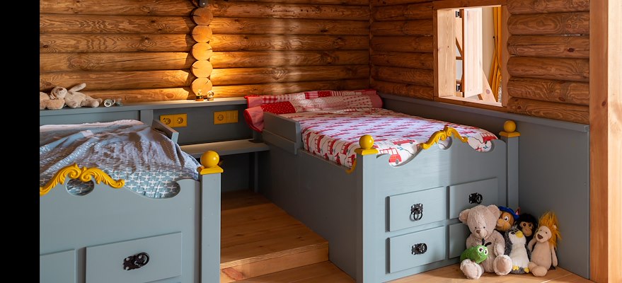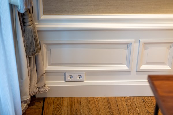 In een compleet andere sfeer zien we in slaapkamers enkele kleuren terugkomen van het JUNG programma Les Couleurs® Le Corbusier. Rustige hemelsblauwe KNX-tasters en contactdozen passen bij de hemelsblauwe bedrand, kussens en lambrisering in de ene slaapkamer. Contactdozen met en zonder USB lader en KNX tasters in okergeel maken de kinderkamer af. En als laatste variant van JUNG is in de woonkamer en bij de badkamer het strakke LS 990 programma toegepast in alpine wit dat onopvallend opgaat in de achtergrond van de witte lambrisering, het glas van de spiegel en de witte plinten. Een ingetogen of juist bijzonder kleurrijk ontwerp? JUNG heeft de passende schakelaars.