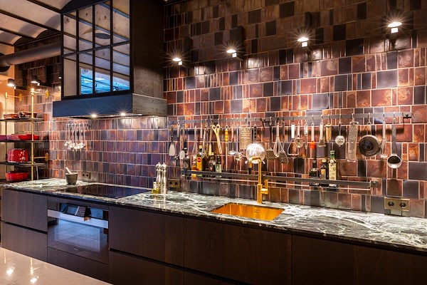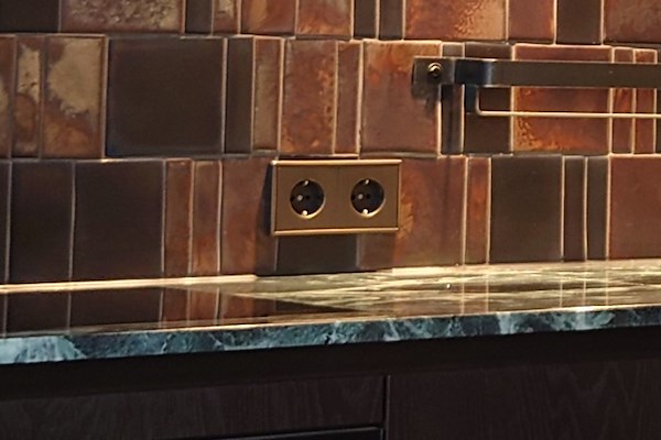 Ook past het Messing antiek perfect bij de ambachtelijke sfeer die wordt opgeroepen door de donkere kleuren beneden, de metalen deuren en de smalle rails (uit de tijd van de steenhouwerij) die over de hele benedenverdieping lopen. Ook de JUNG componenten in Messing antiek, zijn ambachtelijk gemaakt. Zij zijn van echt Messing en het oppervlak is met de hand gepolijst. Dit geeft elk component een unieke uitstraling, waarbij de reflectie van het gepolijste en het goudkleurige Messing elkaar afwisselen. Als bescherming tegen corrosie zijn de componenten tweezijdig gelakt.