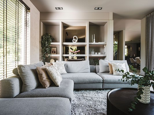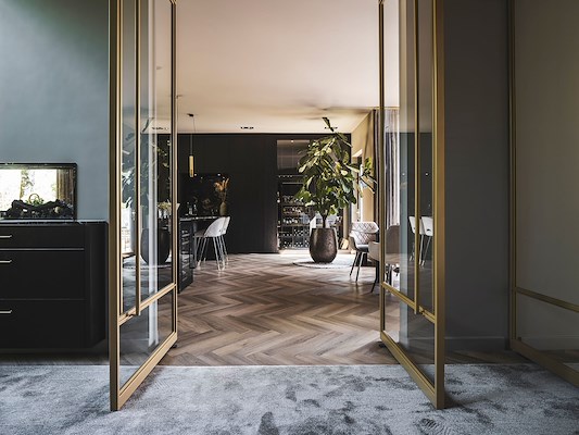 De opdrachtgevers gaven Jeroen de Nijs de vrije hand, met één duidelijke wens: hun huis moest de stijl van een hotellobby krijgen. Dit is door de hele woning prachtig uitgevoerd, waarbij de entree misschien wel het meest een hotelsfeer uitstraalt. Rijke materialen, luxe wandbekleding en een fluweelachtige loper verwelkomen de eigenaars thuis. Meteen vallen er mooie details op. Zoals de zichtlijnen door de hele woning en de open haard in de woonkamer die je bij binnenkomst uitnodigend ziet branden. De trap is een sculptuur op zich, vergezeld van een mooi gevonden set hangplanten. In de entree zit nog een elektrisch tunnelhaardje met doorkijk naar de keuken. Een eikenhouten vloer strekt zich uit over de begane grond en eerste verdieping, een inloop-garderobekast met achterliggend toilet maakt het hotelgevoel compleet.