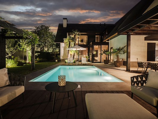 De living gaat over in een ruime keuken. “Deze is twee keer zo groot als de living, het geeft aan hoe belangrijk we die ruimte vinden”, vertelt de opdrachtgever. De indeling met het keukenblok tegen de wand en het ruime kookeiland heeft hij zelf bepaald. “We zijn gek op koken met vrienden en houden van een goed glas wijn. Door de donkere tinten voelt het intiem ondanks dat het er ruim is. Ik denk dat we hier meer tijd doorbrengen dan in de living.” Mooi is ook de directe verbinding met de tuin. De grote pui gaat bij aangenaam weer open en het uitnodigende zwemwater fonkelt je tegemoet. In de avond komt de sfeer van de verlichte tuin door de semi-transparante gordijnen van Chivasso heen het huis binnen. De Bolia-lamp boven de eettafel doet het hier bijzonder goed. Last but not least wordt de keuken vergezeld van een ruime, goed gevulde wijnklimaatkamer.