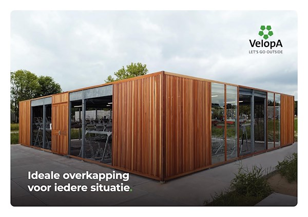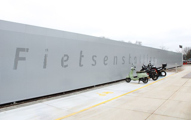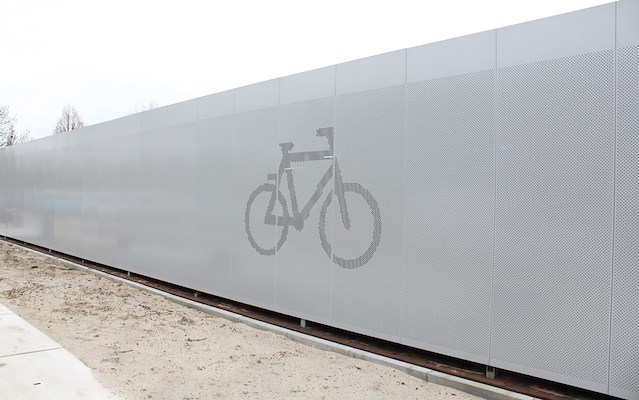 voor het personeel gerealiseerd. De strakke design uitstraling van deze fietsoverkapping was doorslaggevend voor de uiteindelijke keuze van de opdrachtgever en de landschapsarchitect. Het unieke aan de Pixel is dat het plaatwerk voorzien kan worden van een geperforeerde afbeelding en tekst. Er is in dit geval gekozen voor een afbeelding van een fiets en de tekst ‘fietsenstalling’, maar een bedrijfslogo behoort ook tot de mogelijkheden.
