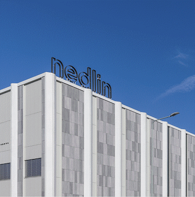 De deuren zijn in het abstract vormgegeven gebouw weggewerkt om het gevelritme niet te verstoren. Bezoekers en werknemers komen overigens allemaal door dezelfde deur naar binnen. De architect had ook de opdracht om het ontwerp zodanig te maken dat er connectie en verbinding zou ontstaan tussen alle werknemers van Nedlin; dus mensen op de werkvloer, het kantoorpersoneel, binnen- en buitendienstmedewerkers en de directieleden. Daarom zijn de kantoren, kleedlokalen en de kantine allemaal bij elkaar op de eerste verdieping gesitueerd. De kantine fungeert als kruispunt. Ter hoogte van de kantoren en de bovengelegen technische en opslagruimten is de gevel bekleed met cementvezelplaat met daartussen vierkante raampartijen.