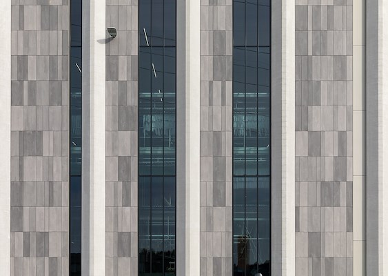 De architect besteedde veel aandacht om de schil van het bouwvolume van hoge kwaliteit te maken. Aan de 96 uit één stuk gegoten betonnen kolommen van 16 meter hoog en 1,1 meter breed die onmiskenbaar een belangrijke bijdrage leveren aan de monumentaliteit van het gebouw. De aandacht voor de gelede gevel aan de voorzijde. Aan de toepassing van 6 meter hoge glasplaten, de grootst mogelijke die verkrijgbaar zijn. Aan de “zwevende” betonnen plint onder het gehele gebouw waardoor het los van de grond lijkt te komen. Ook aan de verschillende breedtes van de tegelstroken, de kleurverdeling en zeker aan het ontwerp van de bevestiging van de tegels aan de buitengevel is veel tijd besteed. De Terra Tone 206-tegels van Mosa bestaan uit drie tinten grijs en dat levert mooie kleurschakeringen op en het geheel van vlakken maakt een groots gebaar.