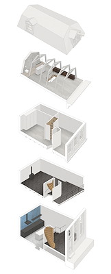 De visie om het nieuwe interieur zo ruim mogelijk te maken is waargemaakt door op elke woonlaag gebruik te maken van een open plattegrond, ruimtebesparende schuifdeuren, efficiënte trappen en ranke balustraden. Zo is de zolderverdieping met mansardekap volledig gestript en opnieuw ingedeeld met een open trappenhuis en transparante badkamer.