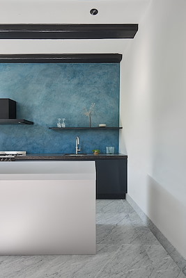 Om de keuken en badkamers op de open verdiepingen een behaaglijke uitstraling te geven, zijn deze afgewerkt met een ambachtelijk vervaardigd, waterdicht kalkpleisterwerk. Met name de achterwand van de keuken, die door de split level relatief hoog is, draagt door de bijzondere eigenschappen van het pleisterwerk, bij aan de nieuwe woonkwaliteit. Bij binnenkomst werkt de diepblauwe wand als een levensgroot schilderij.