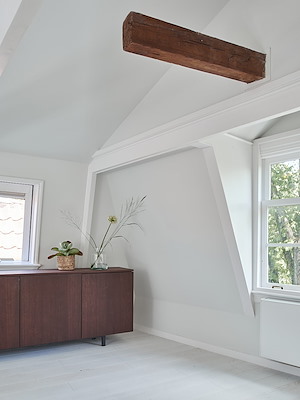 Deze nieuwe ruimtelijkheid zorgt ervoor dat de houten balken en spanten, alsmede de verdiepingshoge ramen met roedenverdeling en zicht op de levendige stad, nog beter tot hun recht komen. De witte vloeren en wanden laten het daglicht tot ver in de woning doordringen. Op maat gemaakte trappen en meubels zorgen voor warme, contrastvolle accenten.