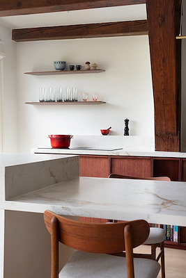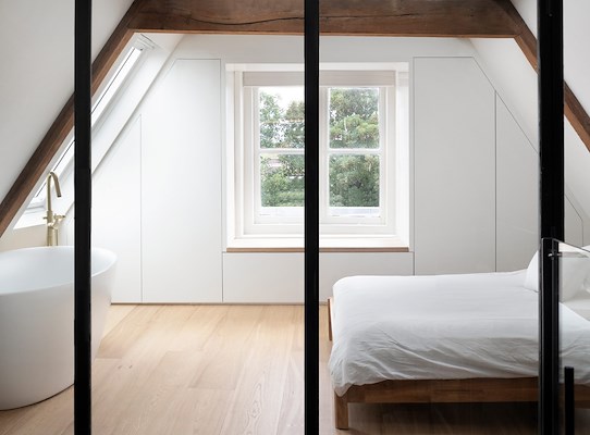 Dit ruime grachtenhuis is onderdeel van een ‘tweeling’, gebouwd in 1696 en gelegen aan de Keizersgracht in Amsterdam. Serge Schoemaker Architects en Studio Mota creëerden op de kapverdieping en zolder van dit rijksmonument een sfeervolle loftwoning, waarbij de houten dakconstructie tot een integraal onderdeel van het interieur is gemaakt.
