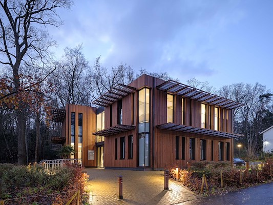 De nabijgelegen gemeente Bloemendaal heeft een opvallend wit, monumentaal exterieur. Het doel was om dit belangrijke gebouw te respecteren door er niet mee te concurreren, maar om zichzelf uit te drukken als een deel van het bos. Daarom werd frakéhout in verschillende maten gekozen als bekledingsmateriaal. Fraké is een thermisch gemodificeerd hout (hydrothermolyse), dat de duurzaamheid en milieuvriendelijkheid van het materiaal waarborgt. Bovendien is er gekozen voor een houten constructie die samen met zijn bekleding het gebouw voorziet van langdurige functie en schoonheid.