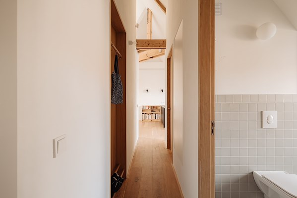 Een mezzanine met kast en trap zijn als één geheel ontworpen en uitgevoerd in eikenfineer. Het meubelstuk steunt op de draagmuur enerzijds en hangt aan de dakconstructie anderzijds. Zo ontstaat een slaapkamer dat zich nestelt als een klein huisje in de nok van het dak. Omdat er geen ondersteuning nodig in het zitgedeelte van de woonkamer, blijft de ruimte open en luchtig. De mezzanine bestaat uit een eenvoudig balkenplafond dat bijdraagt aan een knusse zitruimte eronder. Gaten in het plafond ter ventilatie van het bovenliggende matras dragen tevens bij aan de compositie met de balken.