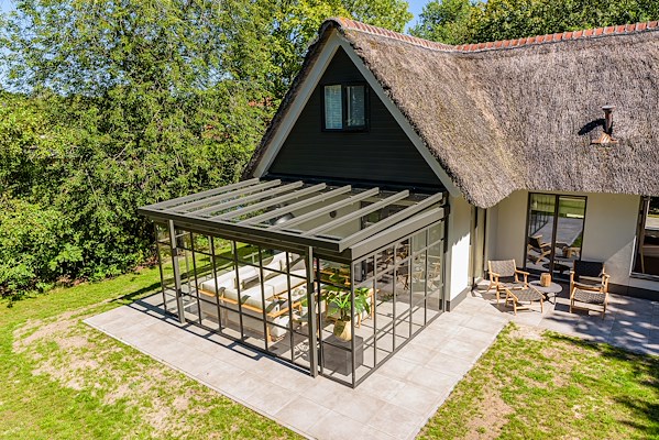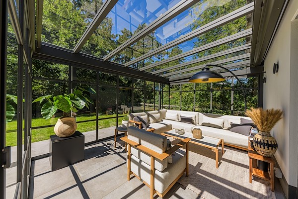 met zijn steellook integreert vlekkeloos met de architectuur van het huis. De roedeverdeling in het glazen draai-/vouwsysteem is zowel in de tuinkamer als in de uitbouw bewust asymmetrisch uitgevoerd, wat bijdraagt aan een open en moderne uitstraling die perfect aansluit bij de stijl van de woning.