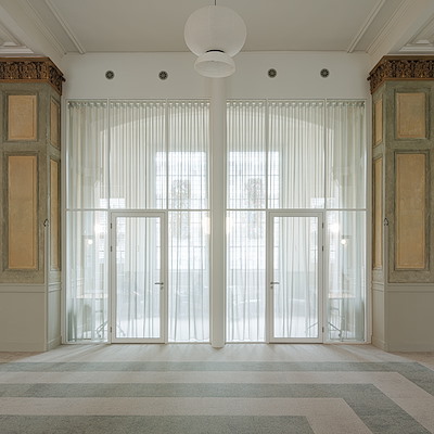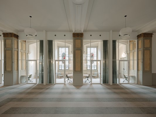 Tussen elke twee zuilen bevinden zich twee behandelkamers met elk een ‘eigen’ glas-in-loodraam. De slanke puien (C2C gecertificeerd) van de behandelkamers zijn terugliggend tussen de zuilen geplaatst. Translucente gordijnen zorgen voor voldoende privacy in deze behandelkamers maar zijn tegelijkertijd transparant genoeg zodat het licht ook het hart van het interieur bereikt en de zuilen zichtbaar blijven. In het hart van het gebouw bevindt zich de kantoorruimte inclusief lunchruimte en keuken als centrale ontmoetingsplek voor het personeel. Met de transparante opzet en het subtiele gebruik van groengrijze kleuren cree¨ert het nieuwe ontwerp een harmonieuze en gastvrije sfeer waarin de rijke historie van het monument wordt gerespecteerd, omarmd en voelbaar blijft.