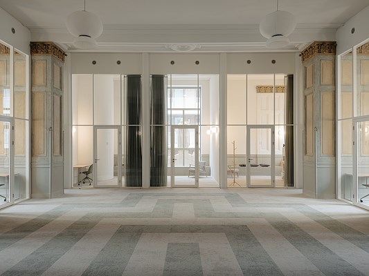 Zicht op het dubbelhoge middenschip met slanke C2C puien en circulaire tapijttegels