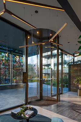 De indrukwekkende hoge tourniquetdeur heeft een 'Art Metal' coating. Deze coating past prachtig bij de messing afwerking in de gevel en het interieur.