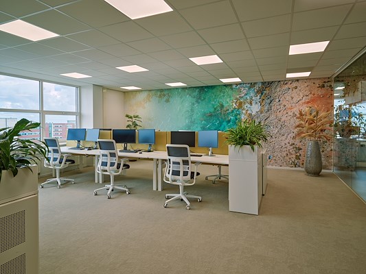 Wat een fijne sfeer hangt er in het nieuwe kantoor van IDC Metri. Het kleurenpalet sluit perfect aan op het natuurlijke behang, wat zorgt voor een kantoor dat rust uitstraalt.