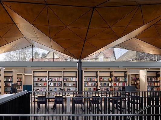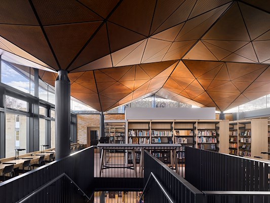 The library’s faceted ceiling is a central part of the design, which evokes spreading tree branches. All of the