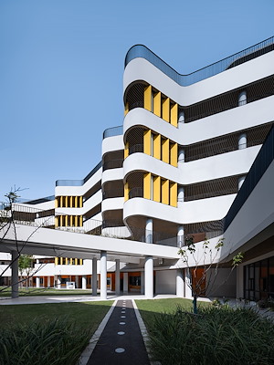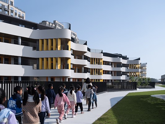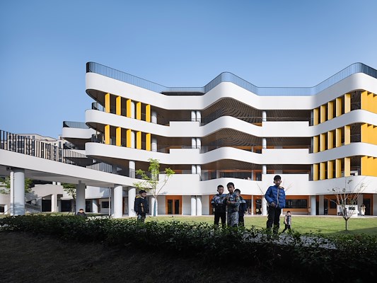 Inspired by the site's canal and by the lyrical drawings of late architect, Zhang Zai Yuan, the formal language of the school is dream-like, another world, a world of innovation, creativity, and difference. The familiar school typology of slab with external corridor is increasingly distorted toward the school interior courtyard. Observed at first by a crank in the slab, then by a bent window, then by parabolic bay windows, and soon by lines of balconies vibrating with movement. As if reality has been shaking — like a rope held at one end, with waves of different sizes hurtling along its length, suddenly stopped in a frozen moment.