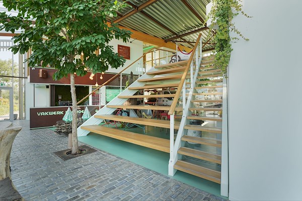 De stijlen aan de buitenzijde van het hoofdgebouw zijn van hout. De keuze voor verticale houten delen voor de gevel geven het pand een unieke en natuurlijke uitstraling. Extra bijzonder is het logo dat in deze gevel is uitgefreesd.