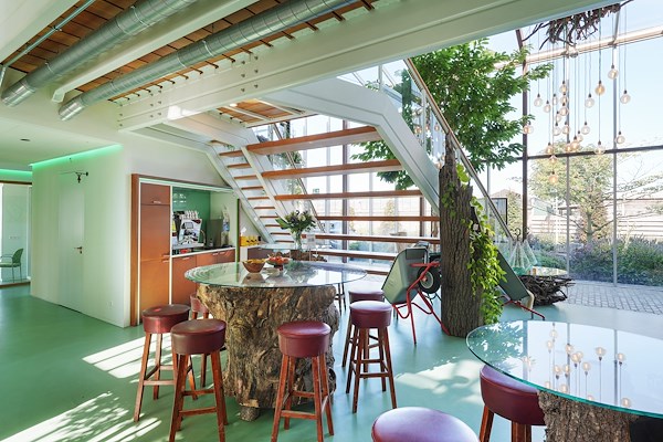 Kantoorruimte met inrichting d.m.v. unieke tafels en stoelen