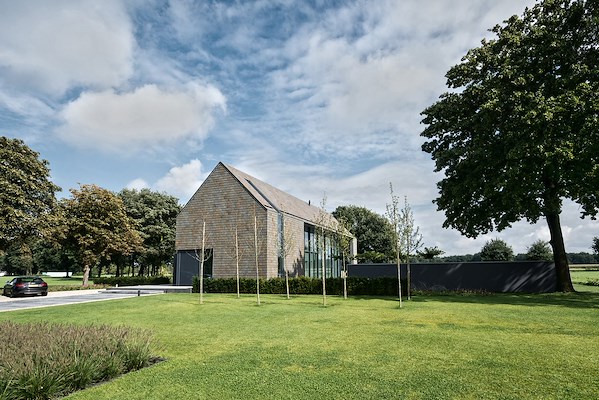 In de landelijke omgeving van Noord-Limburg is een moderne villa ontworpen. “De situering van het pand, midden in de akkers, eveneens omringd door glastuinbouw, was de aanleiding voor het ontwerp. Het huis is een glazen kas met daaromheen een schil van Leisteen. Het geheel is incl. terras op een verhoogd plateau geplaatst, zodat het gebouw als “landmark” boven de omliggende velden uitsteekt”.