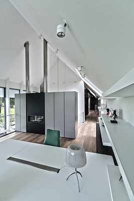 De open structuur, terug-liggende verdiepingsvloer en dwarsgeplaatste trap in de woning zorgen voor verbondenheid binnen het gehele volume.