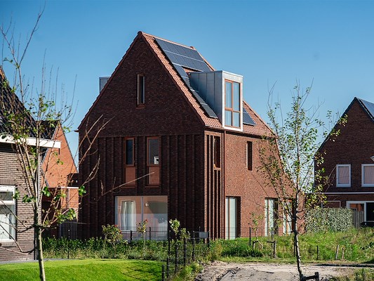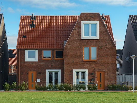 Voor de twee-onder-een-kap woning is uitgegaan van een eenvoudige morfologie als kenmerk van het dorp. De kap is doorgezet tot 5.40m boven het maaiveld, zodat de schaal van de woning fraai past in het straatbeeld. De plattegrond van de twee-onder-een-kapwoning is symmetrisch, maar in het gevelbeeld is de samenhang van de dubbele woning als één entiteit zoveel mogelijk benadrukt.