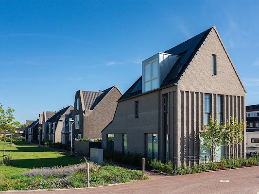 De afwisseling tussen kleine en grotere ”korrels” wordt als stedenbouwkundig principe doorgezet door de afwisseling tussen rij woningen, twee-onder-een-kap woningen en dorpsvilla’s. De eenvoudige dorpse rommeligheid en de differentiatie van het morfologische dakbeeld zorgen voor een ontspannen en vertrouwd straatbeeld. Door het monochroom ton-sur-ton kleurgebruik wordt de architectonische morfologie extra versterkt.