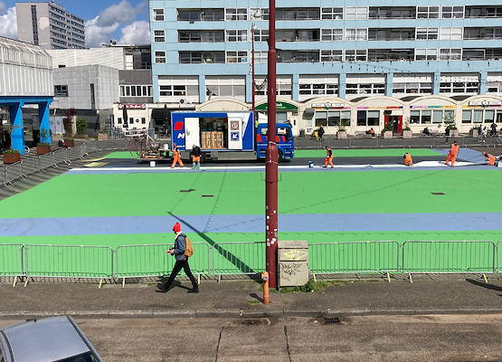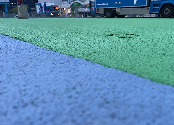ging aan de slag om het plein te voorzien van de nieuwe oppervlaktecoating. Ze begonnen met het schoonmaken van de ondergrond, inclusief de bestaande coating, waarna het geheeld werd uitgevlakt. Vervolgens kon de vakverdeling worden afgetaped, waarna de Triflex Preco Cryl Kaltplastik SP 3K machinaal werd aangebracht. Het geheel werd in twee delen uitgevoerd, verdeeld over verschillende dagen.