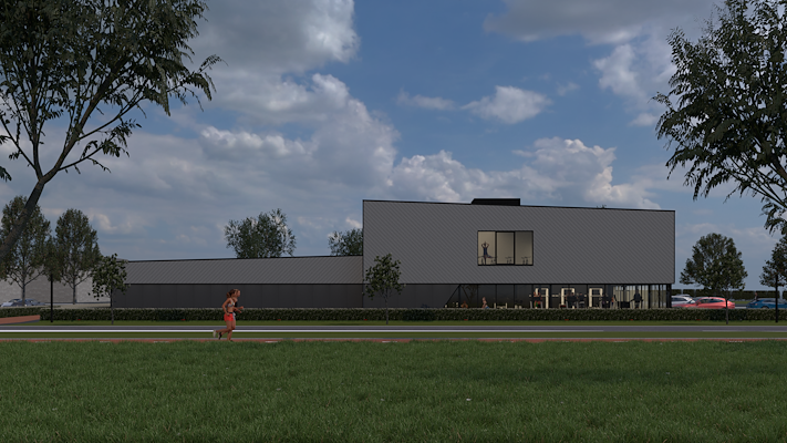 Het ontwerp is opgebouwd uit twee volumes. Één volume bevat de ondersteunende functies zoals de kleedkamers, fysiotherapie, kantoor, kantine en een bar voor ontspanning. Het grote volume bevat de fitnessruimte en de groepsruimten voor spinning en bokslessen. We hebben de volumes een schuin aflopend dak gegeven voor een dynamisch beeld. Dit dak hebben we aan de buurtzijde groen en natuur-inclusief gemaakt. Het dak boven de fitnessruimte is een zonnedak en bevat 132 zonnepanelen om het gebouw in energie te voorzien.