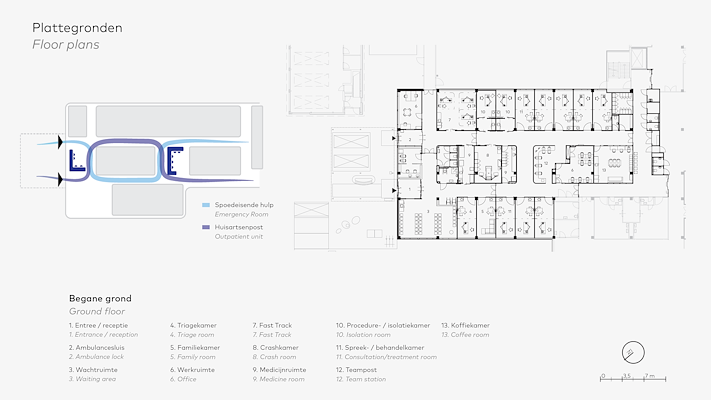 De Spoedpost is altijd een stressvolle werkomgeving. Iedere patiënt verwacht acuut geholpen te worden. Daarom is de nieuwe Spoedpost erop gericht om rust te brengen. Voor zowel de zorgverleners als de patiënt. Ronde vormen, warme materialen, veel groen, functionele verlichting en duidelijke bewegwijzering typeren het ontwerp. Voor patiënten is één ingang, één ontvangst- en inschrijfbalie en één wachtruimte. Het hart van de afdeling is de centrale Teampost. In de omliggende 12 kamers kunnen zowel de huisarts als de spoedeisende hulparts hun werk doen. De patiënt kan in dezelfde ruimte blijven. Het ontwerp zorgt ervoor dat de logistieke stromen intuïtief goed lopen.